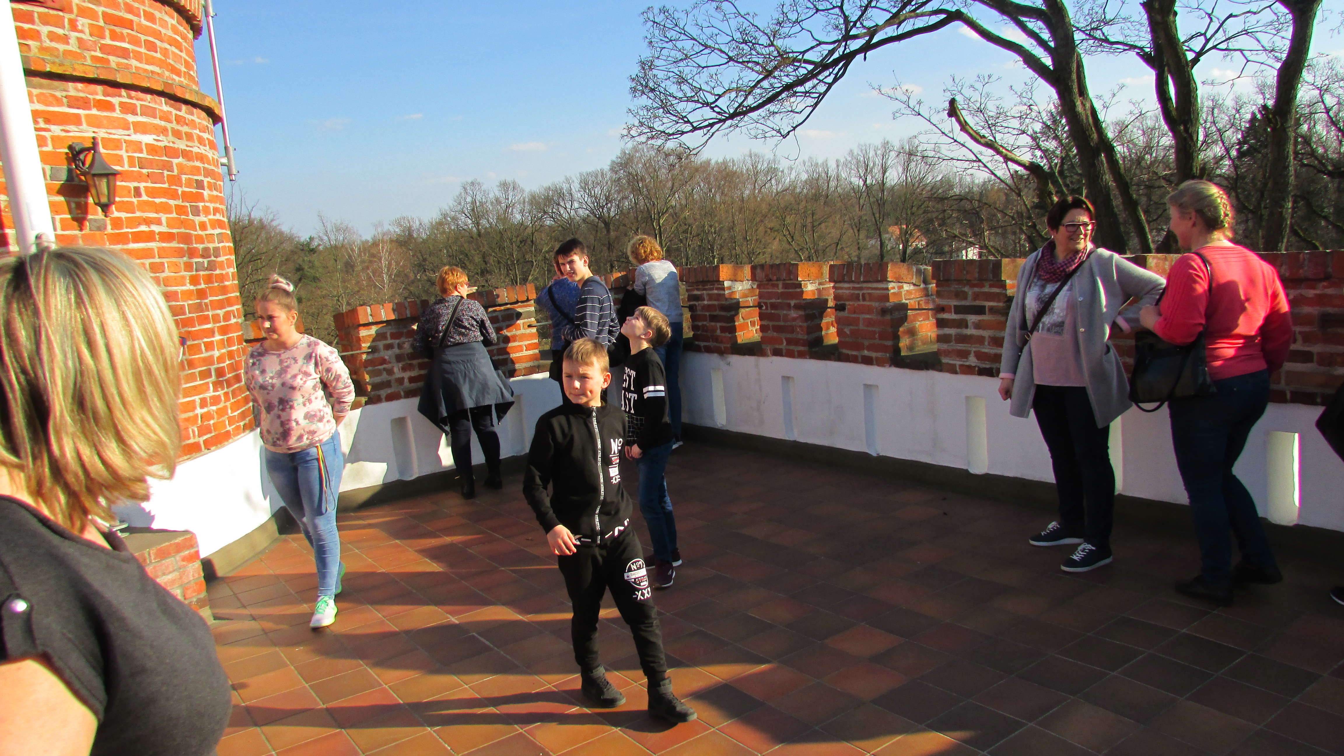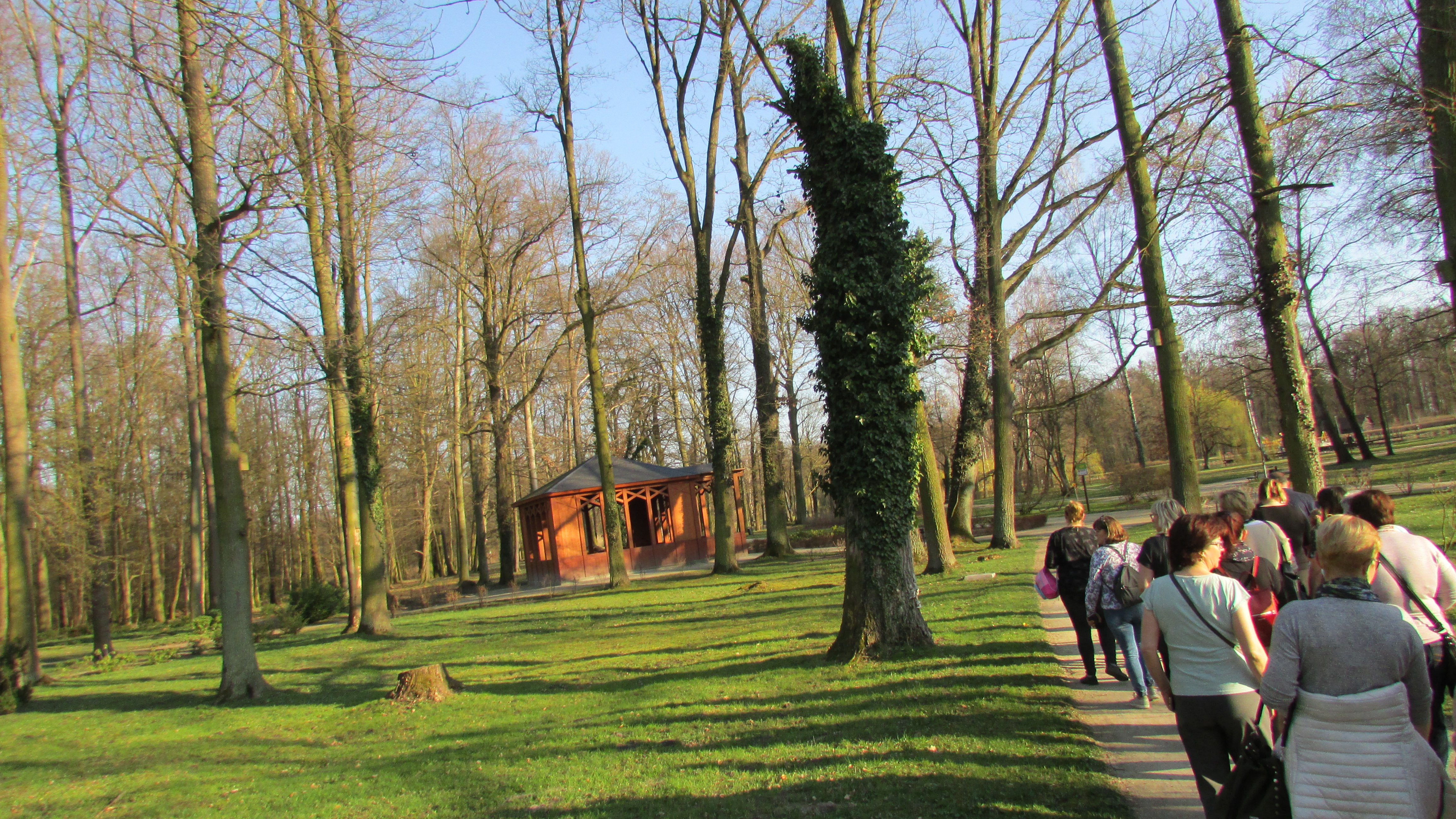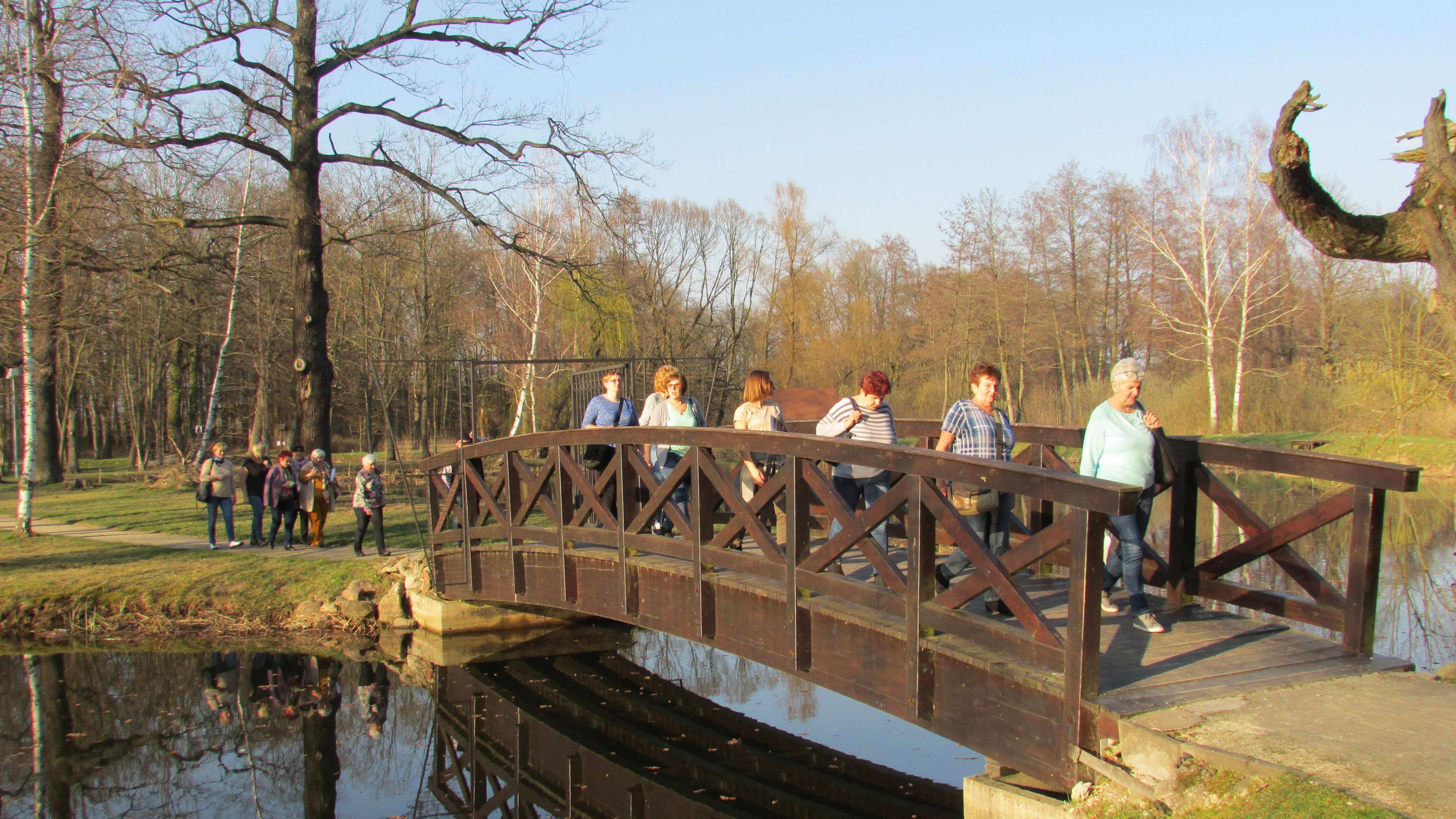Kolejny przystanek był w Żmigrodzie, gdzie zwiedzaliśmy Zespół Pałacowo-Parkowy zaczynając od obronnej wieży mieszkalnej, zwanej basztą. Ruiny zamku otoczone są romantycznym parkiem, który powstał na przełomie XVIII i XIX wieku na powierzchni mniej więcej 15 hektarów. Piękna wiosenna pogoda sprzyjała by podziwiać małą architekturę (wyspę z dwoma mostkami i placem wypoczynkowym z miejscem na ognisko, grillem, pergolą i tzw. domkiem chińskim). Każdy znalazł inspirację do swoich ogrodów.